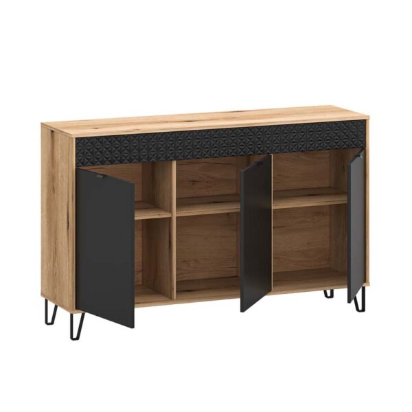 Komoda RRK-1 z kolekcji Arizona w kolorze Dąb Artisan. Szerokość: 152 cm, głębokość: 38,9 cm, wysokość: 83,7 cm. Komoda posiada trzy szuflady i trzy szafki z półką. Korpus wykonany jest z wysokiej jakości płyty laminowanej o grubości 16 mm. We frontach wykonano podchwyty ułatwiające otwieranie. Opcjonalnie można dokupić oświetlenie LED NEO-13 w kolorze białym zimnym, montowane w wieńcu górnym.