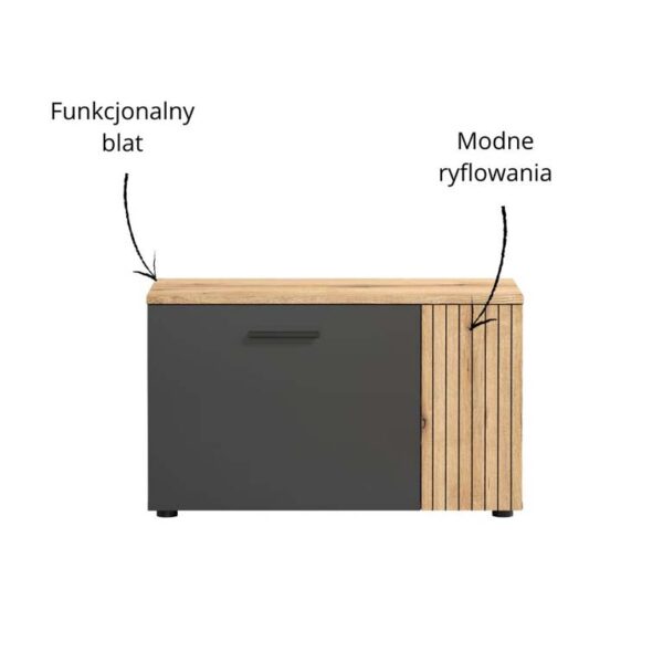 SZAFKA NA BUTY łączy funkcjonalność z eleganckim designem, oferując przestronną półę, pojemnik otwierany do góry. Posiada również miękkie i stylowe siedzisko. Wykonana z wysokiej jakości materiałów, zapewnia solidność i trwałość, idealnie komponując się z różnymi stylami wnętrz. Półka pomieści dużą ilość obuwia, a dodatkowa pojemnik jest doskonały na akcesoria, takie jak szczotki do butów czy wkładki. Drzwiczki otwierane do zewnątrz umożliwiają łatwy dostęp i wygodne użytkowanie, czyniąc tę szafkę nie tylko estetycznym, ale i bardzo praktycznym elementem wyposażenia każdego przedpokoju czy garderoby.