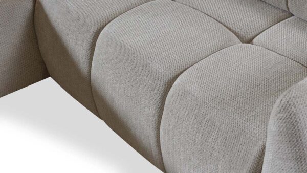 Narożnik Storm Mini. Posiada 3 przesuwane oparcia z funkcją relax zagłówka (można odchylić je do tyłu) oraz elektrycznie wysuwany jeden podnóżek (w opcji). Wypełnienie siedziska to pianka wysokoelastyczna typu HR i sprężyny faliste, które zapewniają komfort siedzenia. Wysokość samego siedziska to 47 cm.