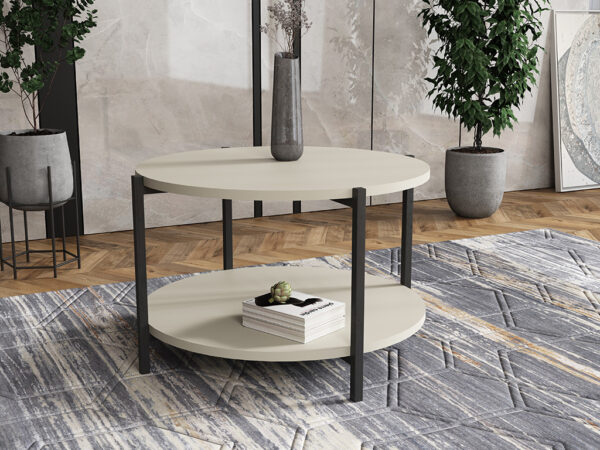 Stolik kawowy STK M6 w stylu nowoczesnym. Stolik ma wymiary ⌀ 65 lub ⌀ 75 i wysokość 50 cm. Nogi wykonane z metalu w kolorze czarnym. Blaty laminowane w kolorze do wyboru.