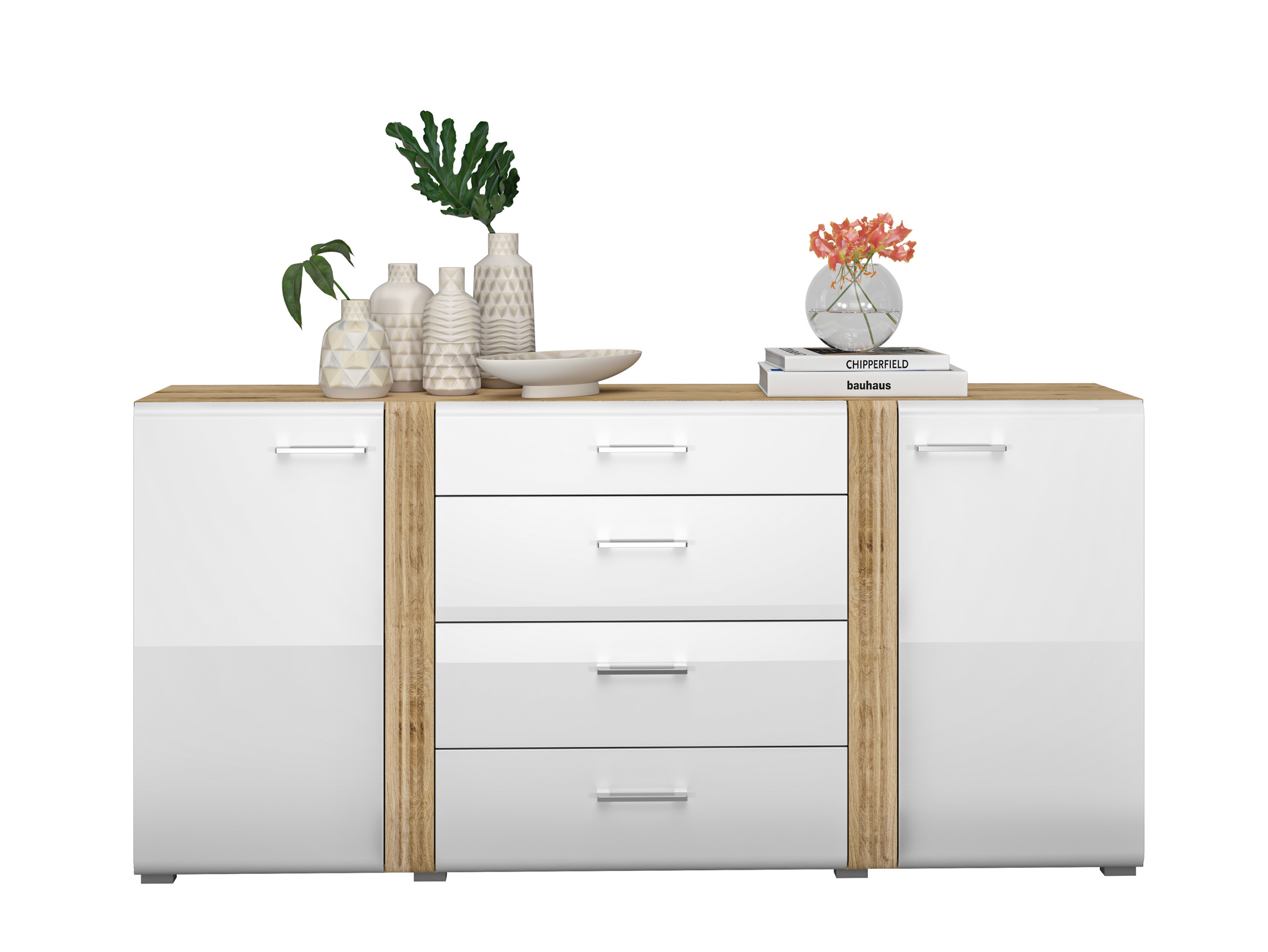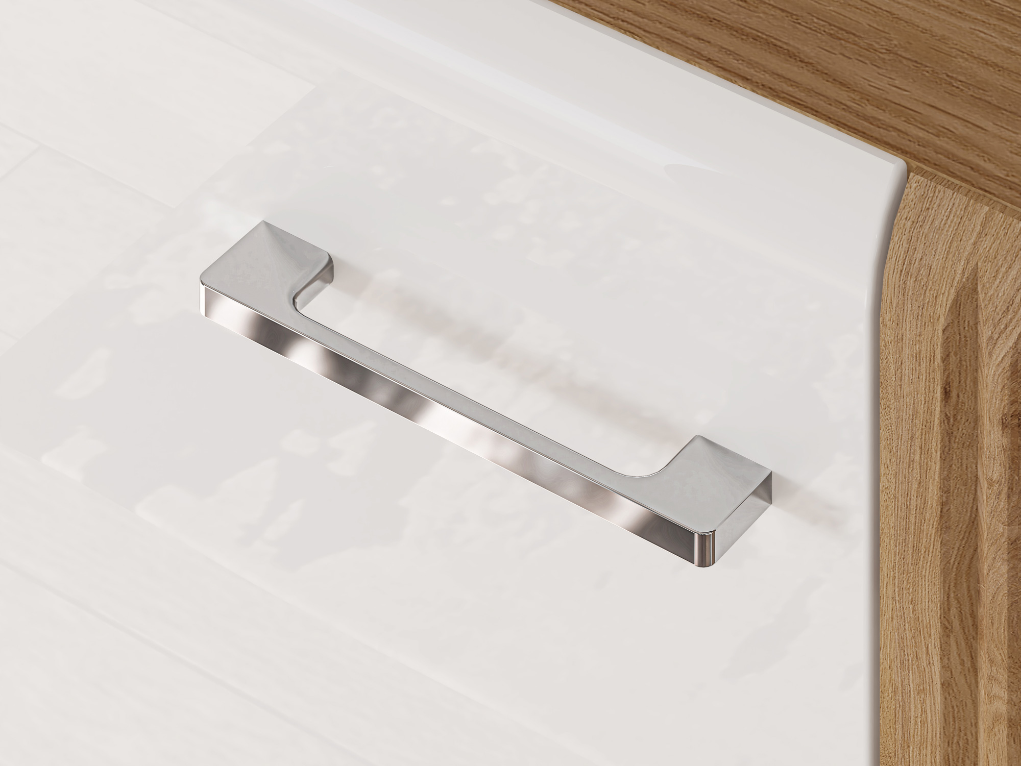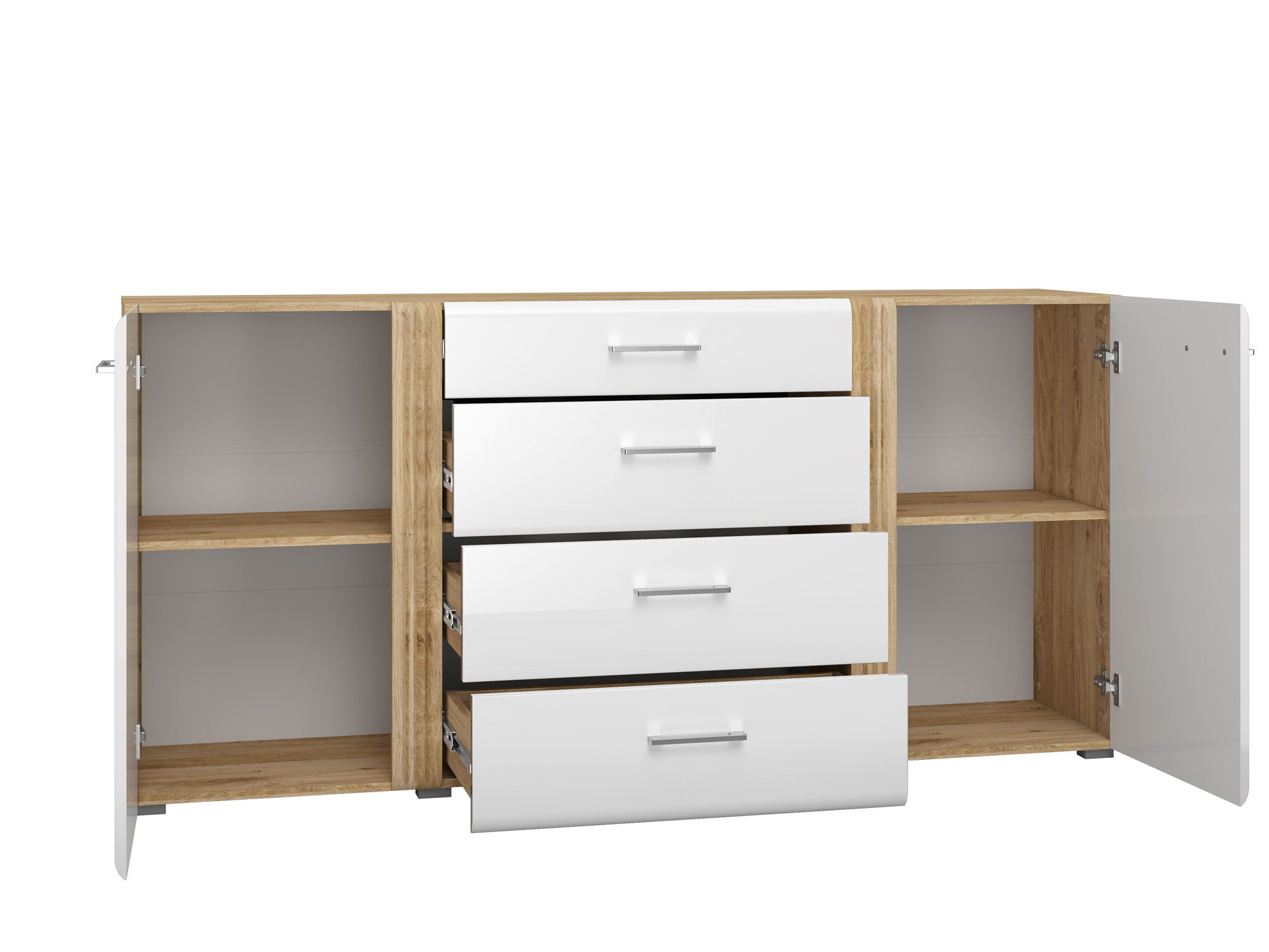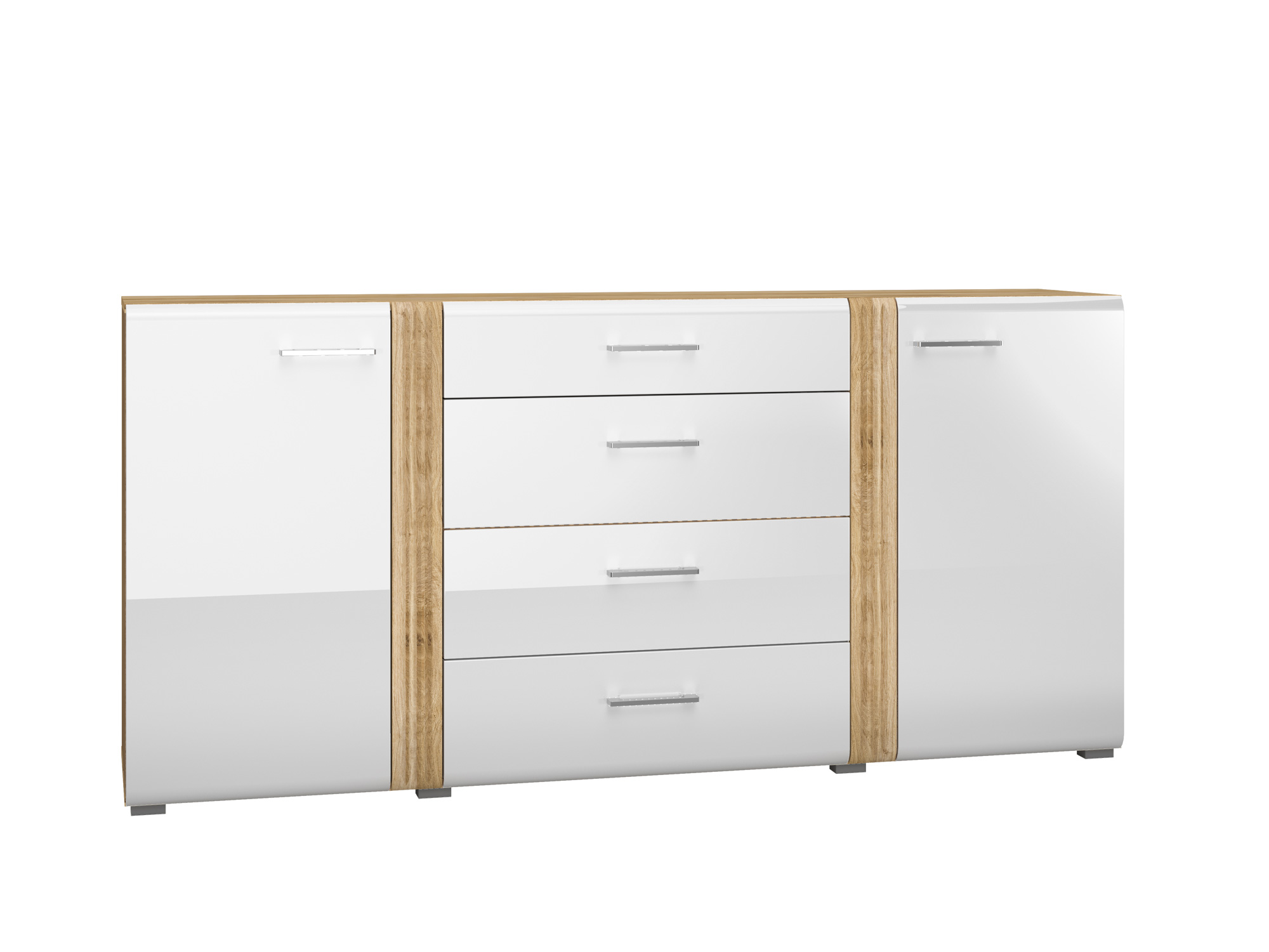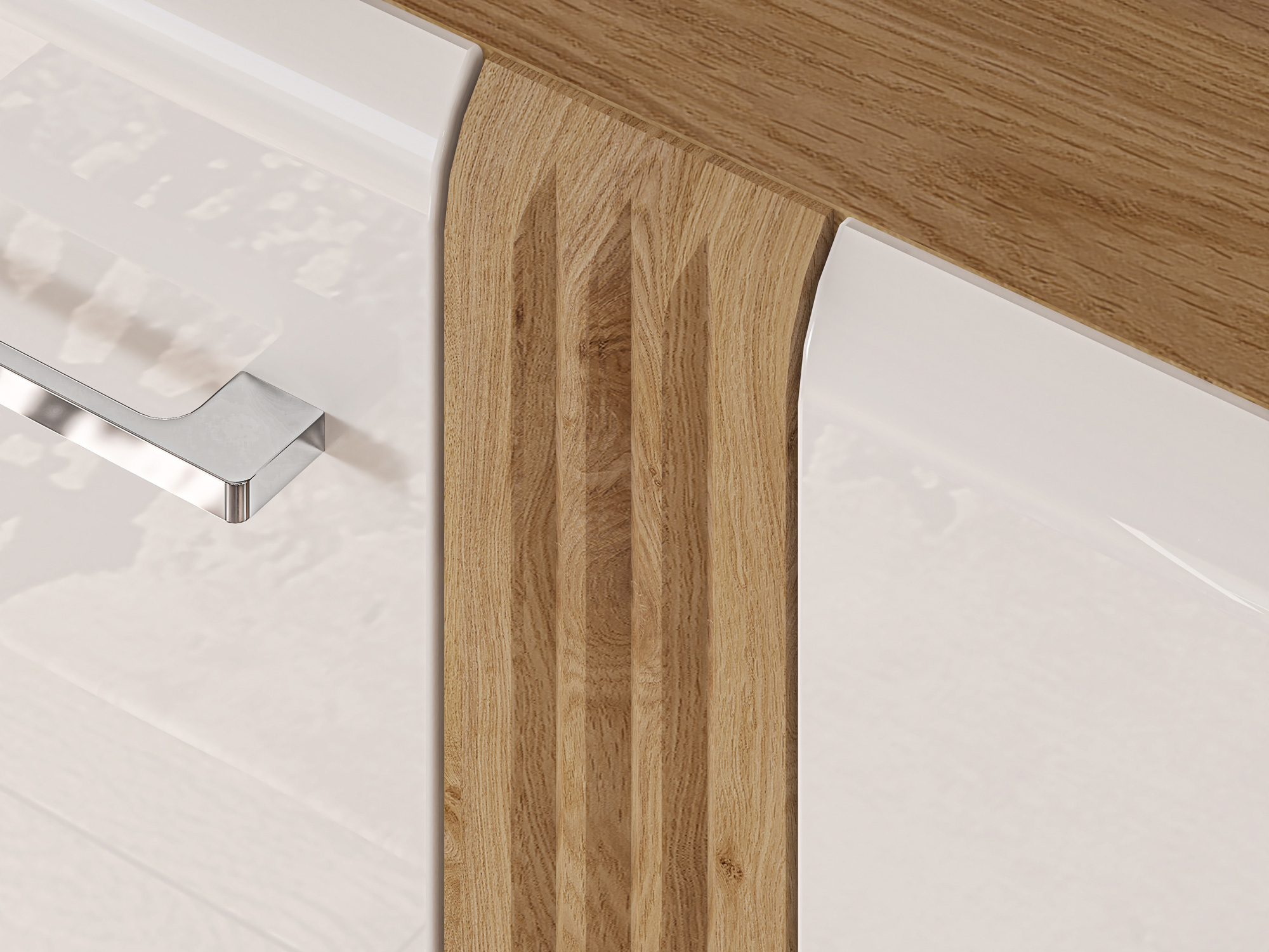 • Prowadnice z funkcją pełnego wysuwu szuflad.Kolekcja Adagio to wysokiej jakości, funkcjonalne meble do pokoju dziennego. Biały połysk frontów zestawiony z naturalną, dębową barwą korpusów tworzą połączenie, które dobrze wpisze się zarówno w nowoczesne, jak i klasyczne wnętrze. Gładka powierzchnia mebli wraz z metalowymi, chromowanymi uchwytami powiększą optycznie przestrzeń. Oryginalne ryflowane wstawki w odcieniu korpusów to element dodający bryłom jeszcze ciekawszego wyglądu. Zaoblone ku górze fronty przełamują prostą linię brył, wplatając nieco ekstrawaganckiej stylistyki. Użyte dekory i faktury materiałów tworzą harmonijną całość mebli Adagio.
