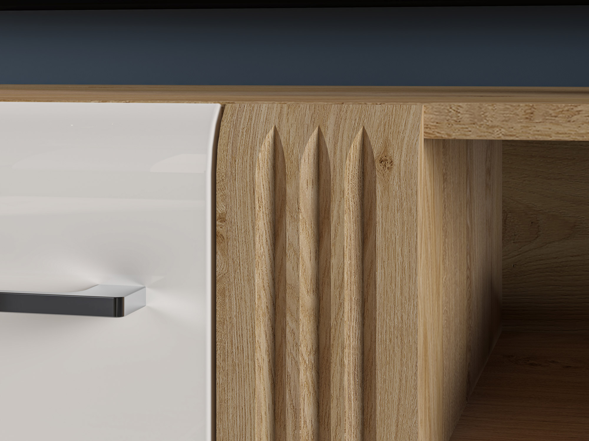 • Prowadnice z funkcją pełnego wysuwu szuflady.Kolekcja Adagio to wysokiej jakości, funkcjonalne meble do pokoju dziennego. Biały połysk frontów zestawiony z naturalną, dębową barwą korpusów tworzą połączenie, które dobrze wpisze się zarówno w nowoczesne, jak i klasyczne wnętrze. Gładka powierzchnia mebli wraz z metalowymi, chromowanymi uchwytami powiększą optycznie przestrzeń. Oryginalne ryflowane wstawki w odcieniu korpusów to element dodający bryłom jeszcze ciekawszego wyglądu. Zaoblone ku górze fronty przełamują prostą linię brył, wplatając nieco ekstrawaganckiej stylistyki. Użyte dekory i faktury materiałów tworzą harmonijną całość mebli Adagio.