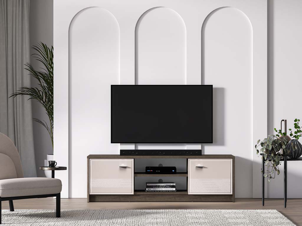 - Funkcjonalność: centralna wnęka na sprzęt RTV z otworem na kable oraz dwie boczne szafki z zamykanymi drzwiczkami – idealne na płyty, piloty i akcesoria.