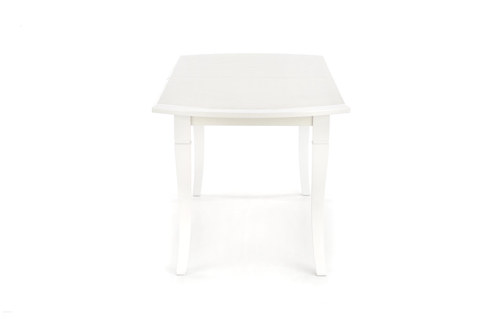 stół rozkładany (prowadnica metalowa + rolka), wymiary: 160÷240/90/74 cm, materiał: blat – płyta MDF laminowana, nogi – drewno lite (bukowe), kolor: biały