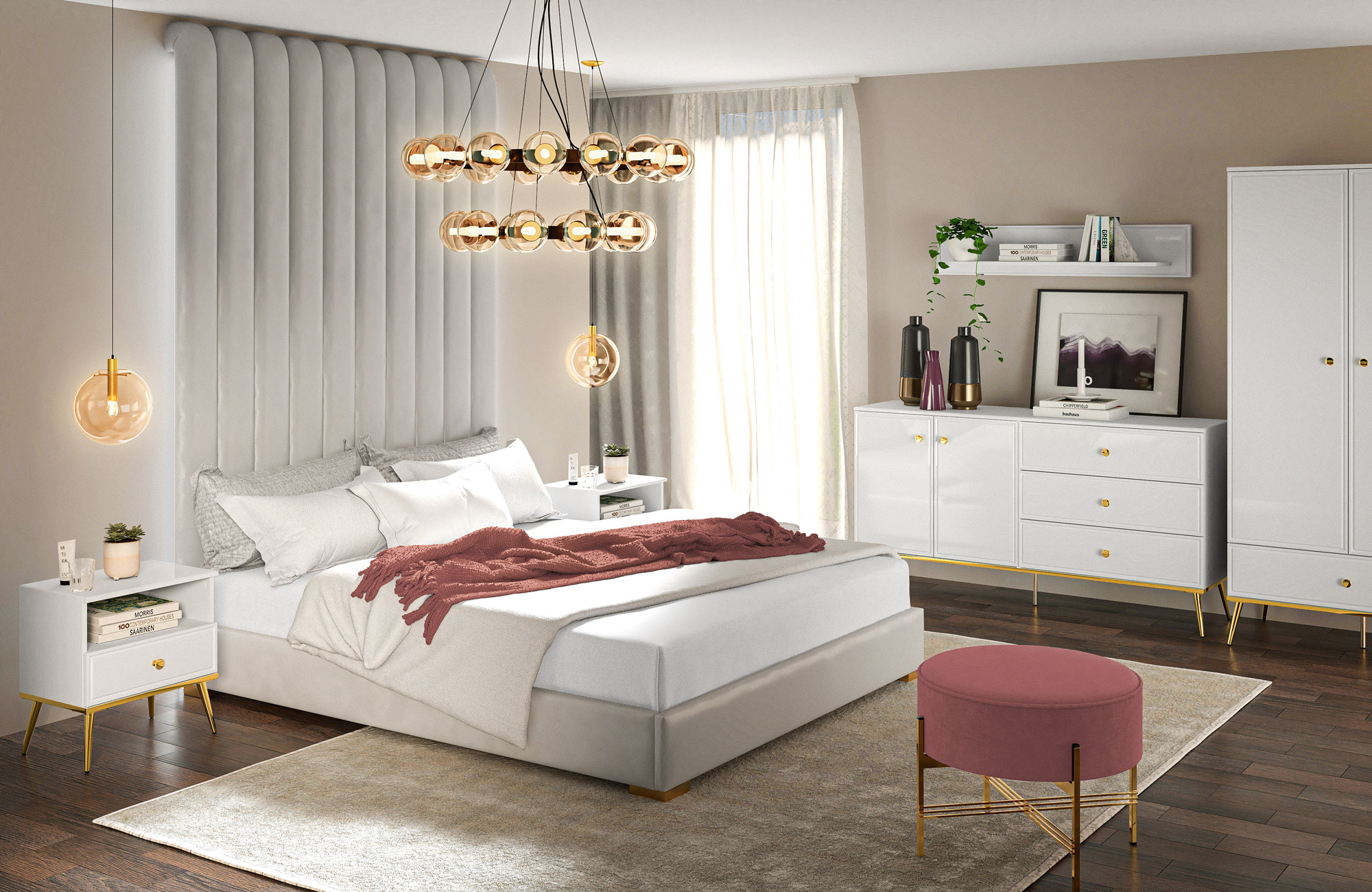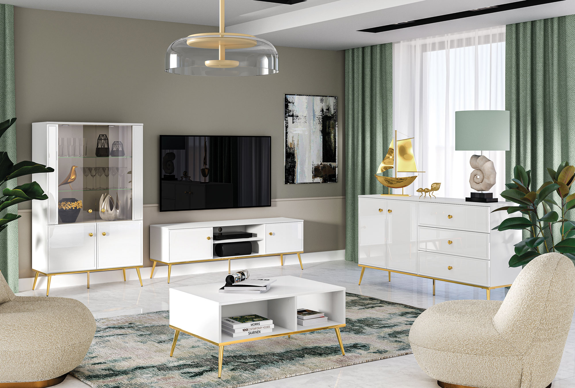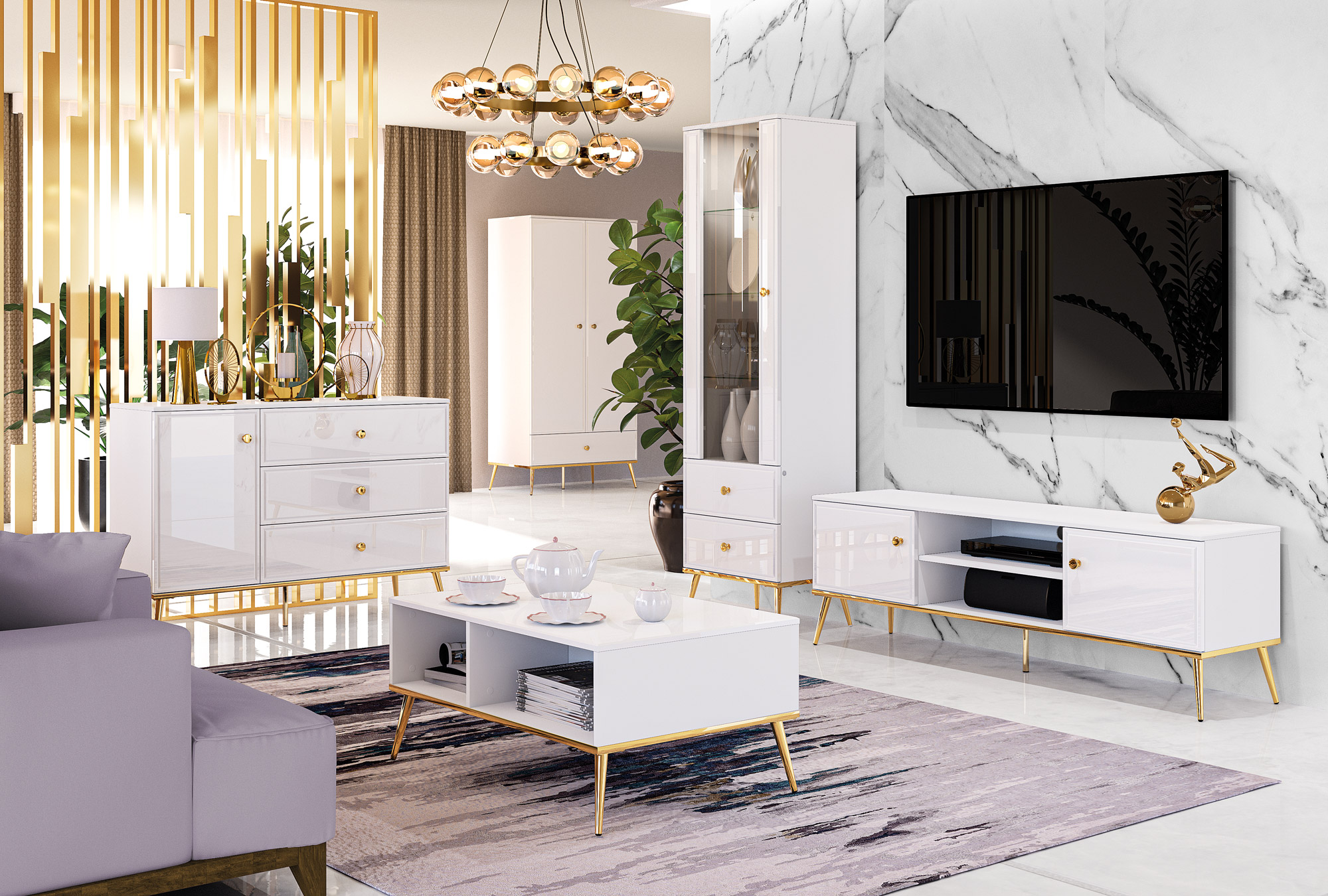 GOLDIN to kolekcja nowoczesnych mebli do salonu, sypialni czy pokoju młodzieżowego. Frezowane fronty oraz złote wykończenie wieńca dolnego stanowi nietuzinkowe rozwiązanie do każdego wnętrza. Połyskująca biel dodaje prostym bryłom oryginalnego charakteru, a uchwyty w kolorze złotym podkreślają ich współczesny styl oraz nadają bryłom dużo elegancji. Modne i praktyczne nóżki sprawiają, że meble prezentują się lekko, a wnętrze sprawia wrażenie bardziej przestrzennego.