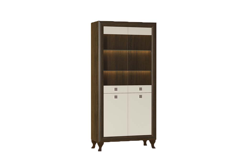 Elegancki i klasyczny kształt oraz ciemny kontur dają dużą dowolność w aranżacji. Beżowe fronty w połysku dodają współczesnego charakteru. W praktycznych zamykanych półkach z łatwością pochowasz drobiazgi, które wolisz ukryć. Natomiast górna przeszklona część pozwoli w elegancki sposób wyeksponować ulubione dekoracje. Charakterystyczną cechą tej kolekcji są wysokie wygięte nóżki z drewna. Szerokość: 96 cm, wysokość: 200 cm, głębokość: 40 cm.