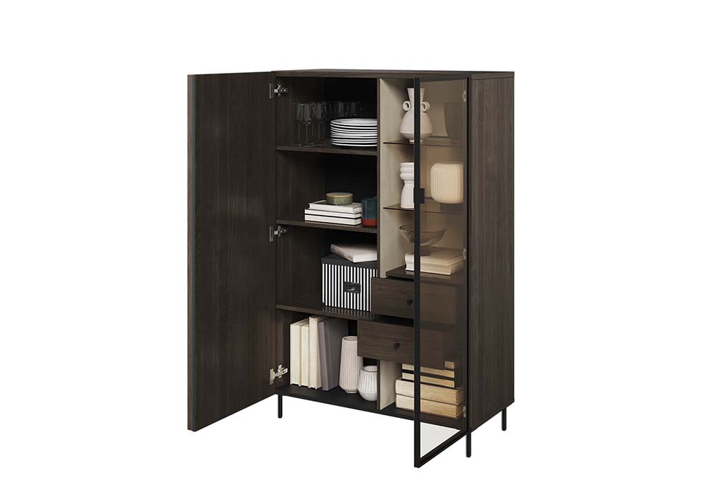 Witryna niska z kolekcji Piemont . Stoi na metalowych, bardzo smukłych nóżkach, które dodają jej lekkości. Jest to wielofunkcyjny mebel. Za pełnymi drzwiczkami jest wystarczająco dużo miejsca na schowanie potrzebnych drobiazgów czy dokumentów. Natomiat po drugiej stronie za szklanymi drzwiami można wyeksponować swoje ulubione dekoracje. Dodatkowe po tej stronie są dwie niewielkie szuflady.