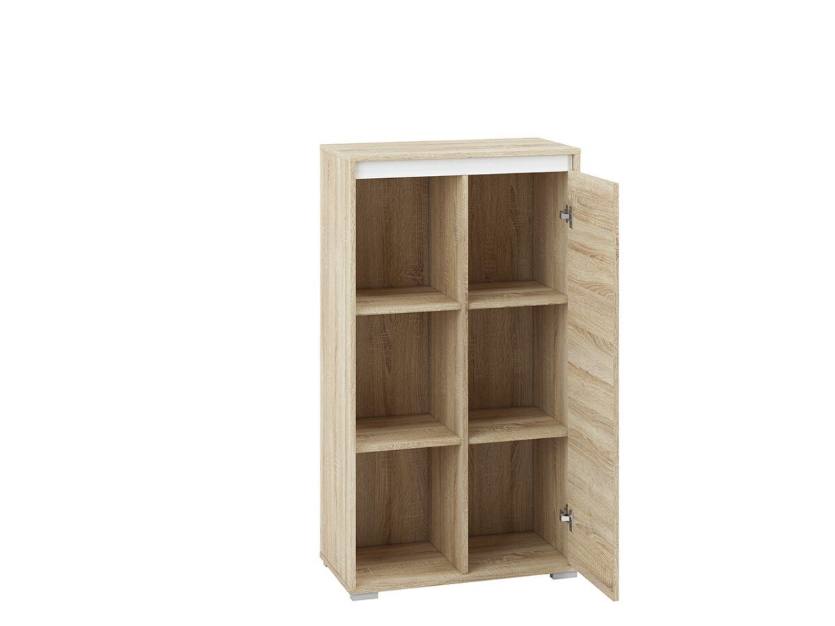 - Funkcjonalność: trzy otwarte półki oraz jedna zamykana szafka z trzema półkami wewnętrznymi