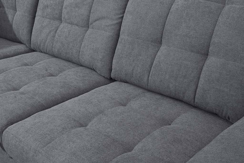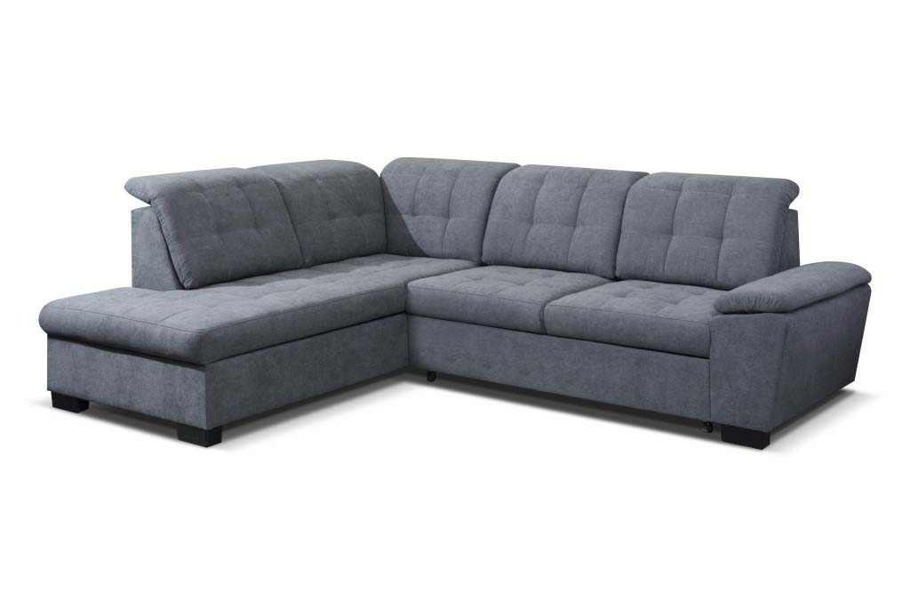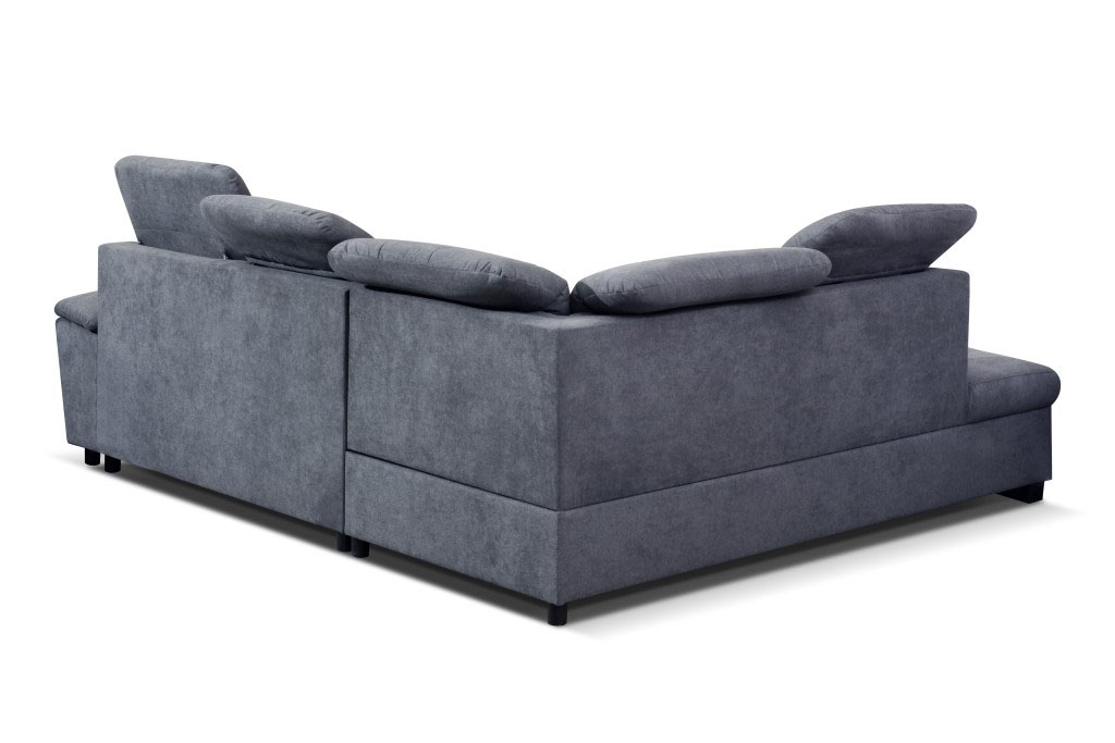 Narożnik PURO z regulowaną, pięciostopniową wysokością zagłówków. Narożnik z funkcją spania rozkładany za pomocą automatu „delfin”. Siedzisko wykonane na sprężynie falistej oraz piance wysokoelastycznej T30. Obity tkaniną tył pozwala na ustawienie mebla nawet na środku salonu. Ozdobne przeszycia oraz szeroki boczek z poduszką na podłokietniku sprawiają, że mebel idealnie będzie pasował do nowoczesnego salonu.