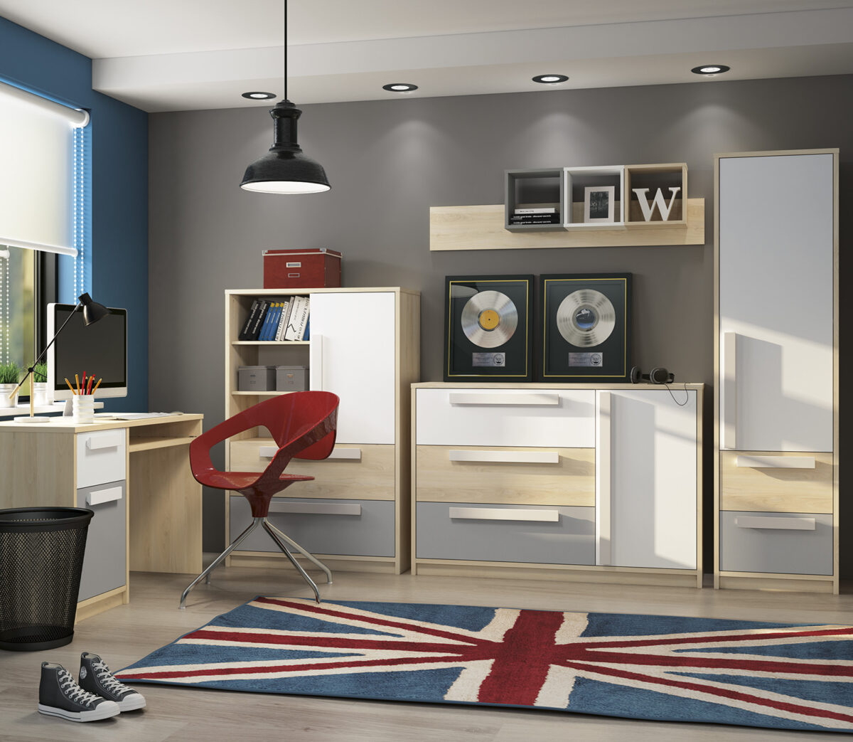 Szafa DROP 0101 to nowoczesny i funkcjonalny mebel, idealny do każdego wnętrza. Wykonana z wysokiej jakości płyty laminowanej, jest odporna na zarysowania, wilgoć i wysoką temperaturę. Kolorystyka w odcieniach Buk Fjord + Biały z wstawką w kolorze Szara Platyna nadaje szafie elegancki i nowoczesny wygląd, który doskonale komponuje się z różnymi aranżacjami wnętrz.