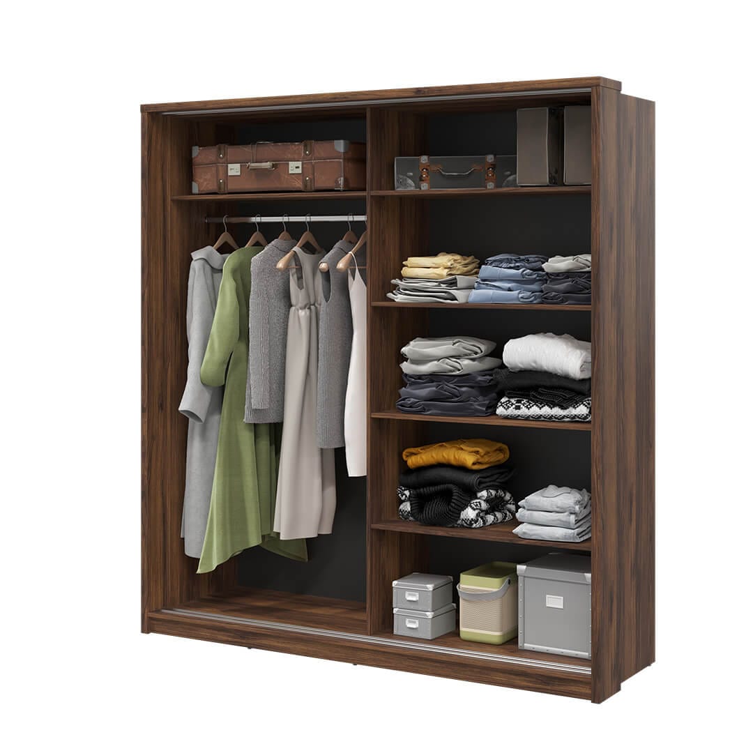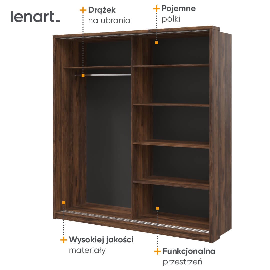 Szafa została zaprojektowana z myślą o praktyczności – oferuje liczne pojemne półki i drążek na ubrania, co pozwala na doskonałą organizację. Przesuwne drzwi nie tylko zapewniają wygodny dostęp do wnętrza, ale także pomagają zaoszczędzić miejsce. Wykonana z wysokiej jakości materiałów, gwarantuje trwałość i niezawodność na długie lata użytkowania.